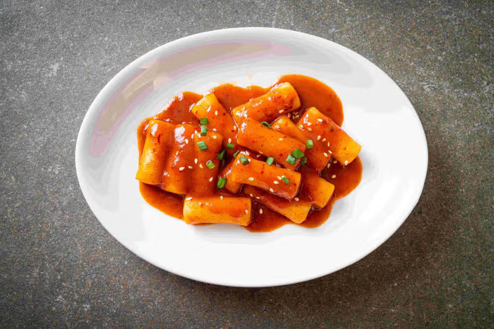 - Tteokbokki: Kue beras pedas dan kenyal yang dimasak dalam saus gochujang (saus cabai fermentasi) yang manis dan gurih.